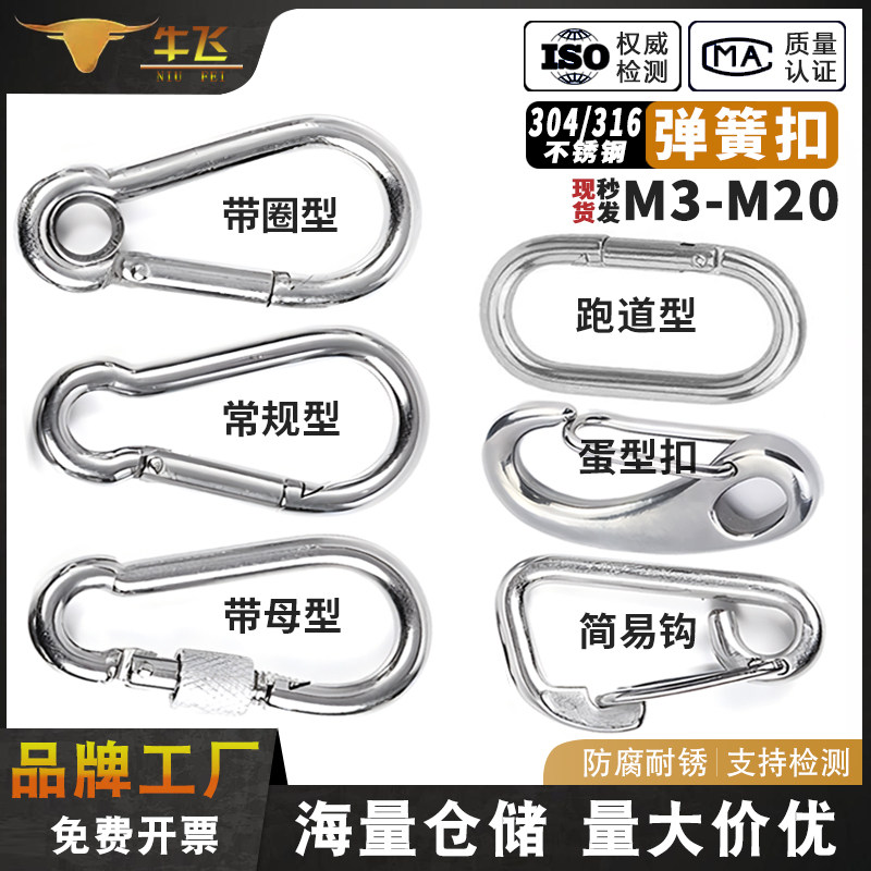 304ステンレス製スプリングバックル、カラビナ、安全バックル、キーチェーン、ホイストバックル、ナット、スプリングループバックル、ドッグチェーンバックル