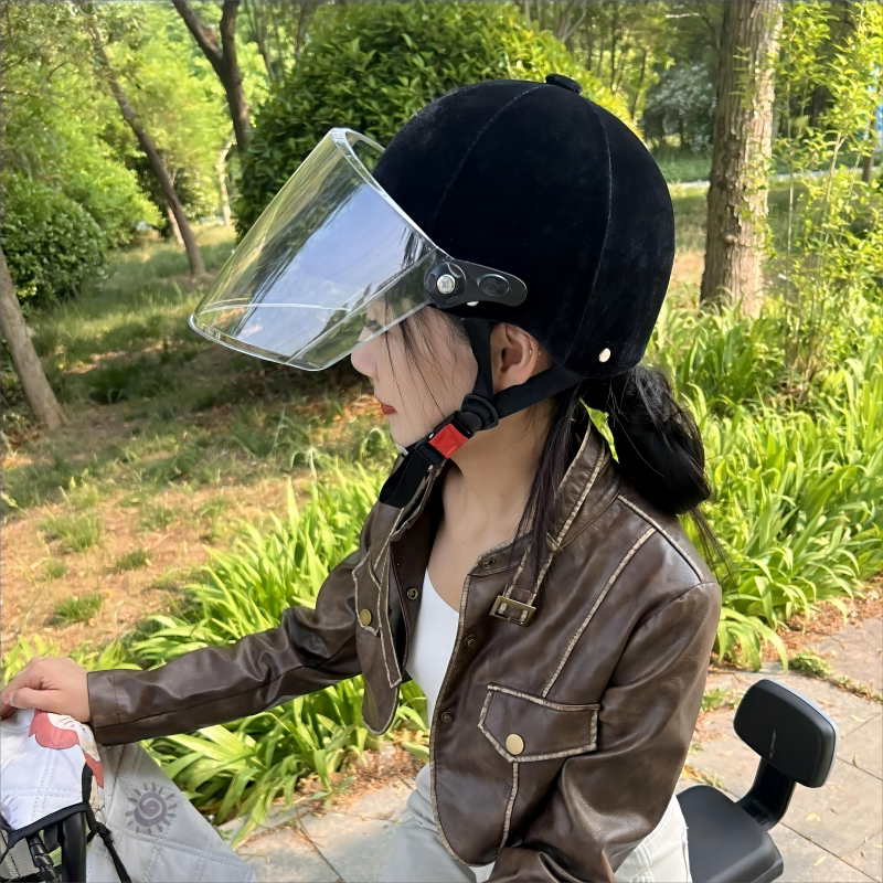 乗馬用ヘルメット、バイク、電動車、屋外保護、防紫外線ミラー、ベルベット、秋冬春夏、女性用布製ハーフヘルメット