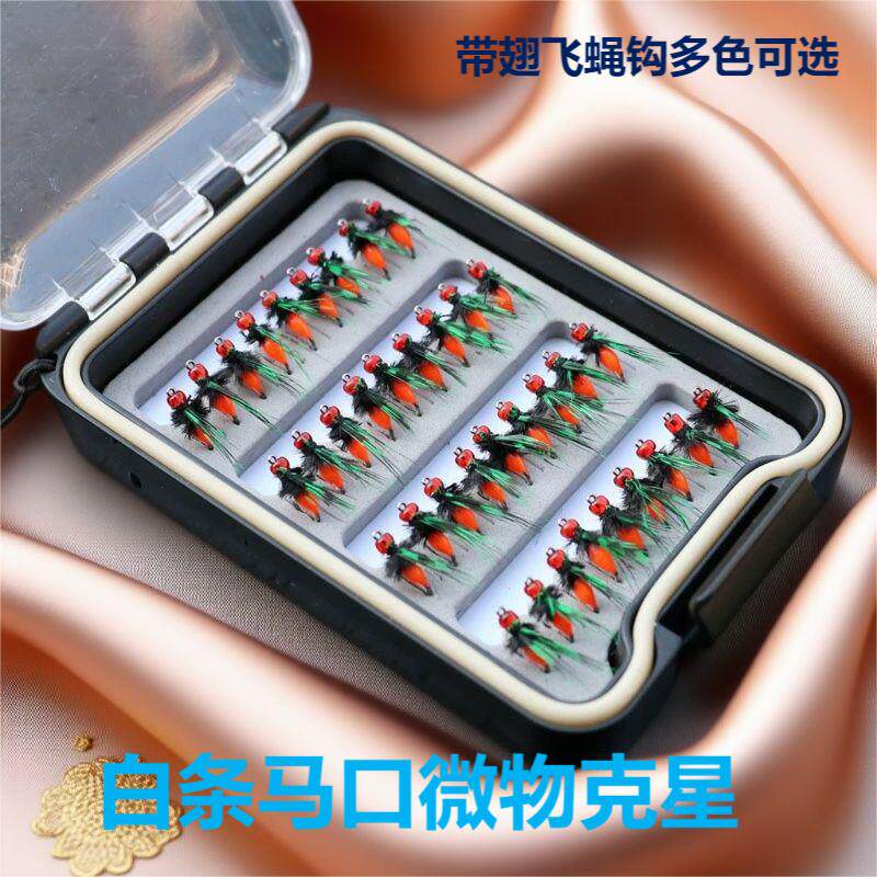ルアーベイト、毒蚊フライフックセット、新しい翼のあるマイクロオブジェクト、ブリキプレート、白いストライプのフライ、フェイクベイトセット、赤、緑色