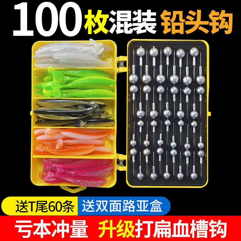 アンチハンギングボトム補強リードヘッドフックルアー、フェイクベイトTテール、ソフトベイト釣りバスマウスビルマンダリンフィッシュソフトワールアーボックスセット