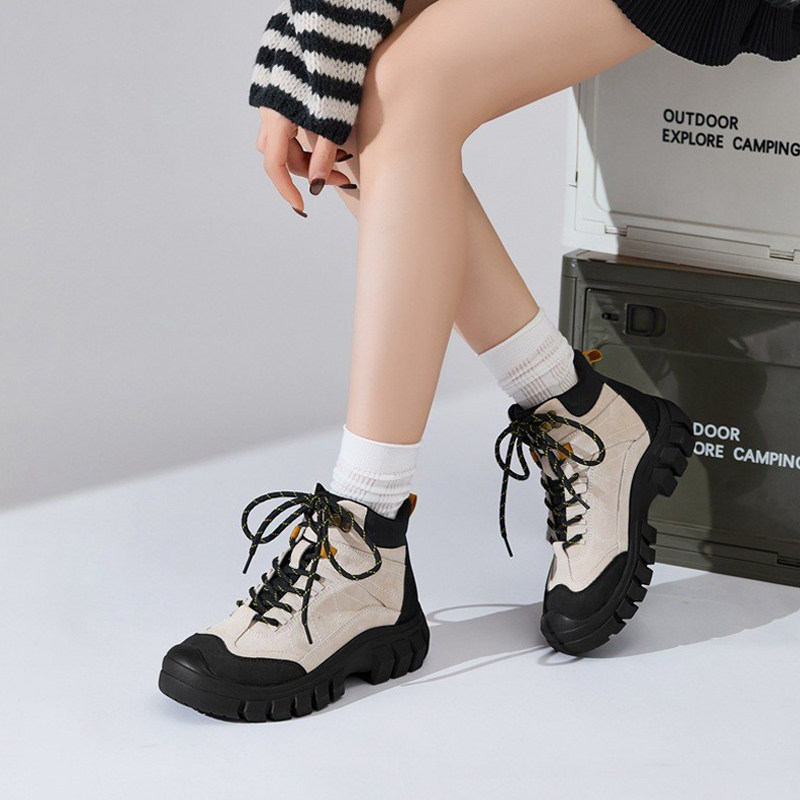 アウトドアハイキングシューズ、女性用滑り止め防水トラベルカーゴブーツ、通気性のあるレザー、マーティンブーツ、プラットフォームソール、ハイキング&クライミングシューズ