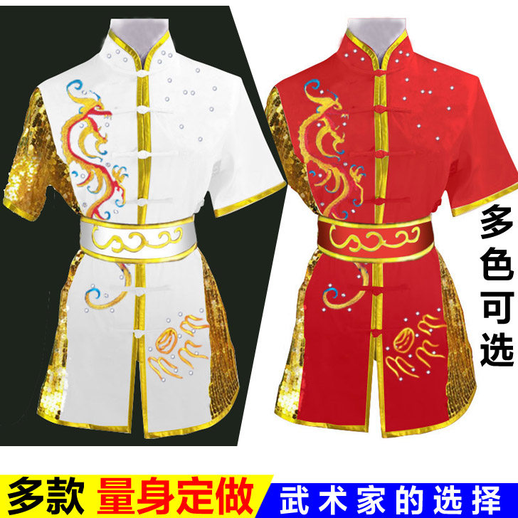 武道衣装、刺繍龍、武道衣装、半袖パフォーマンス衣装、刺繍龍、武道衣装、カンフー衣装、競技衣装、送料無料
