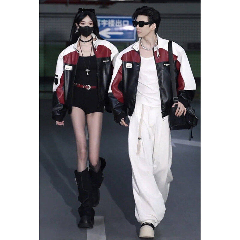 アメリカンPUレザージャケット、メンズの春と秋のスプライシング、対照的なバイクライディングレーシングスーツ、カップルスーツ、ボンバージャケット