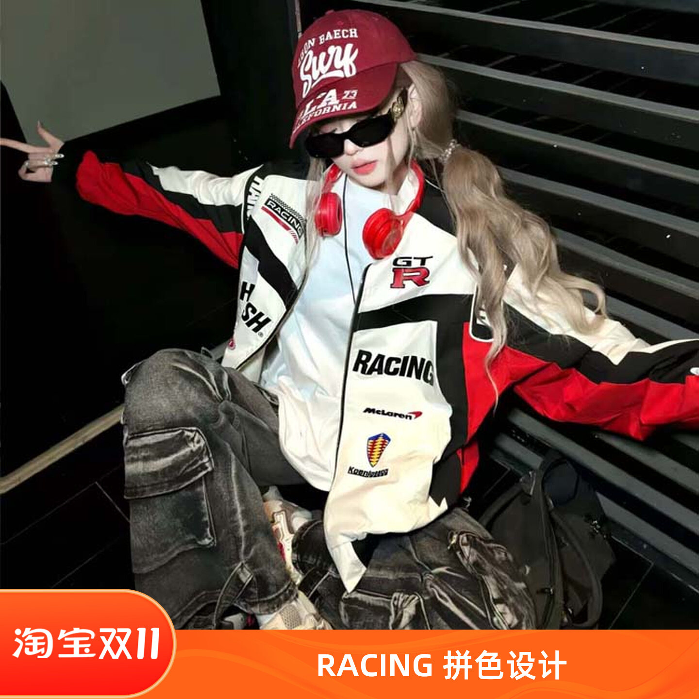 アメリカンレッドのハイストリートスタイルのレーシングユニフォーム、ナショナルタイドの刺繍文字、ハイエンドセンスのバイクスタイル、ゆるいスタンドアップカラー、女性用野球ユニフォーム